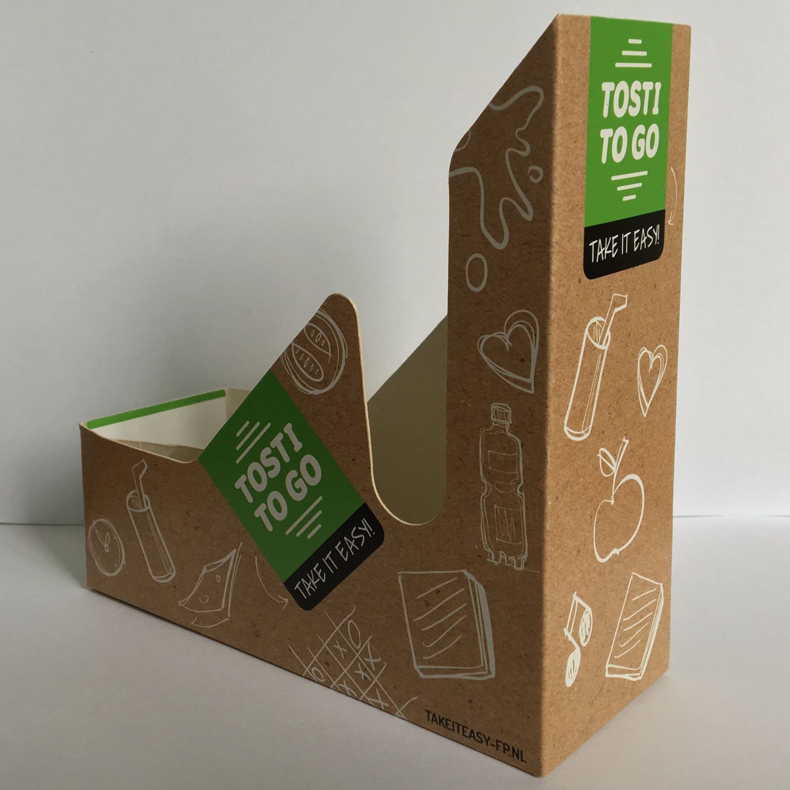 Bovendien biedt de verpakking, naast de functionaliteit, ook haar unieke uitstraling als toegevoegde waarde voor uw afnemers. Zo heeft u de mogelijkheid om de TOSTI TO GO te bestellen voorzien van een bedrukking op maat.